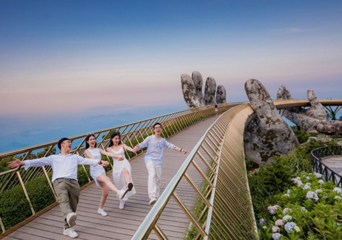 - Chiều: Quý khách thả mình vào không gian tuyệt đẹp như nước Pháp và khí hậu tuyệt vời được ví như Đà Lạt của miền Trung, tham quan vườn hoa, hầm rượu, chùa Linh Ứng, Thích Ca Phật Đài, đặc biệt là chiêm ngưỡng và chụp ảnh Cầu Vàng, cây cầu có kiến trúc độc nhất vô nhị với đôi bàn tay khổng lồ nâng đỡ Cầu Vàng tuyệt đẹp.