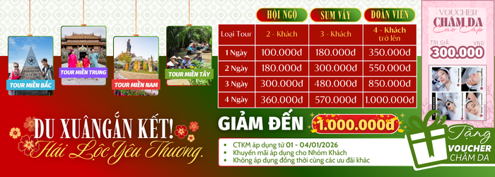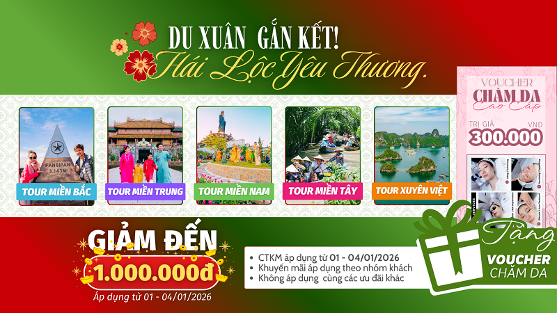 Thời gian áp dụng: Chương trình khuyến mại “DU XUÂN GẮN KẾT - HÁI LỘC YÊU THƯƠNG” dành cho những Quý khách đặt tour có ngày khởi hành từ 01.01.2026 đến 04.01.2026.
