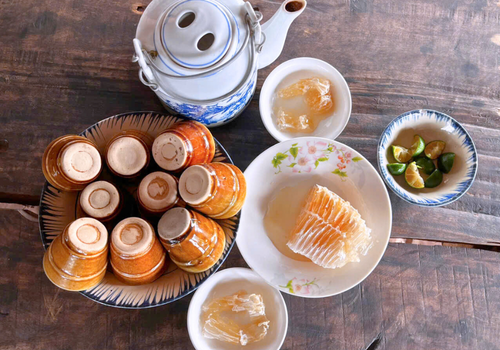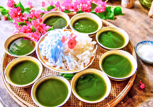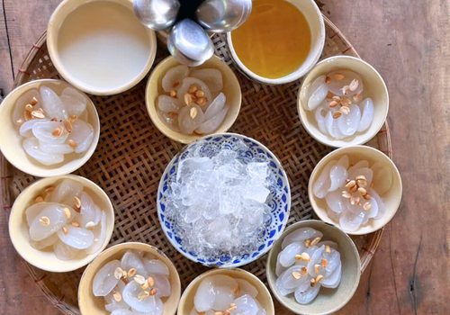 - Sau bữa trưa, Quý khách tráng miệng bằng thạch lá sâm tự tay mình làm ra – một món thanh mát, nhẹ vị, góp phần làm tròn đầy trải nghiệm ẩm thực tại Cồn Chim.