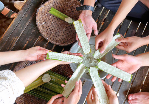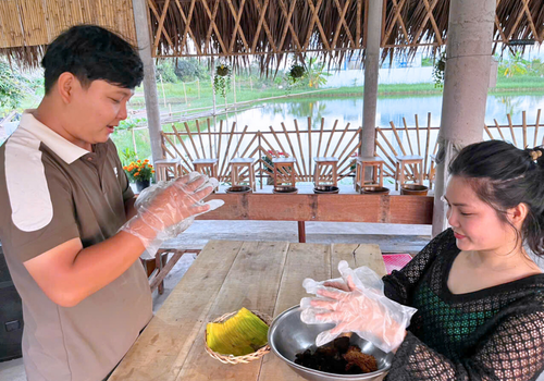- Quý khách được hướng dẫn vò lá sâm – loại thảo dược quen thuộc trong vườn nhà người Nam Bộ, thường dùng làm thạch giải nhiệt. Thành phẩm sau khi vò sẽ được người dân phục vụ trong bữa trưa, như một món thạch thanh mát giúp giải nhiệt và cân bằng lại năng lượng sau hành trình đạp xe.