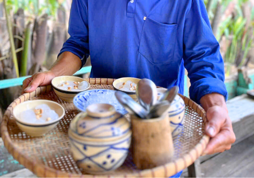 - Bữa Sáng tại Bún Nước Lèo Cô Ba - Bữa Trưa tại cồn Chim: Đặc Sản Miền Tây - Phục vụ Quà Quê trong tour: Ăn bánh lá mơ, thạch lá sâm, chè dừa nước, mật ong bần + trà, trứng nướng đất sét (01 quả/người) |
