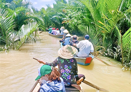 - Quý khách tiếp tục tham gia trải nghiệm ngồi xuồng ba lá (20 phút) tham quan cảnh đẹp miệt vườn miền Tây. Xuồng đưa Quý khách đi dọc theo bờ kênh xanh, len lỏi qua những hàng dừa nước trước khi quay trở lại thuyền lớn để tiếp tục cuộc hành trình khám phá vùng đất “Đồng Khởi”.